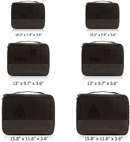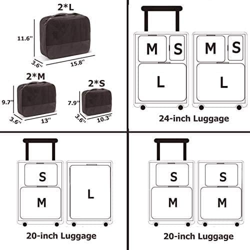 Contains 6 Travel Packing Cubes:2 x Large (15.8” X 11.6” X 3.6”) ; 2 x Medium(13” X 9.7” X 3.6”); 2 x Small(10.3” X 7.9” X 3.6”).