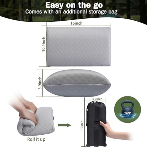 [Lightweight and Easy to Pack]: This Small backpacking pillow measuring 16 x 10.4 x 3.9 inches and weighing just 13 ounces.The airplane pillow is compact enough to easily roll up and store in the included storage bag. The storage bag has a sturdy buckle that is cleverly designed to allow it to be secured to camping gear,hiking pack, or travel luggage