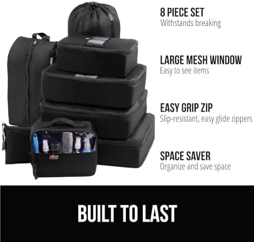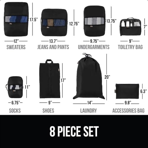 8 PIECE SET: this 8 piece set features cubes for heavy items like jackets and small items like shirts and undergarments; laundry bag and shoe bag included to keep dirty items separate; set includes 8 bag sizes; small 6.75 x 11 inches, medium 9.75 x 13.75, large 13.7 x 12.75 inches, extra large 12 x 17.5 inches, shoe bag 9 x 17 inches, accessory bag 9.8 x 6.3 inches, toiletry bag 9 x 7 inches, and laundry bag 14 x 20 inches