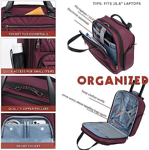 MULTI- FUNCTION PERSONAL BAG: Spacious main compartment works well for clothes/shoes. Features a padded laptop compartment that fits laptops up to 15.6 inches. Easy-access front organizer for small items. Both sides with zipper pockets for the battery and water bottle.