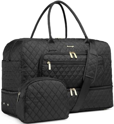 Free Toiletry Bag & Separated Wet Gym Bag: The travel bags for women comes with a toiletry bag to store your cosmetics/toiletries. The toiletry bag is nice for medicines, hair stuff. This black gym tote bag for women has a waterproof PVC lined pocket that separates wet and dry items like clothes, towels and swimsuits. Our womens gym bag is a perfect reliable companion for both indoor and outdoor sports