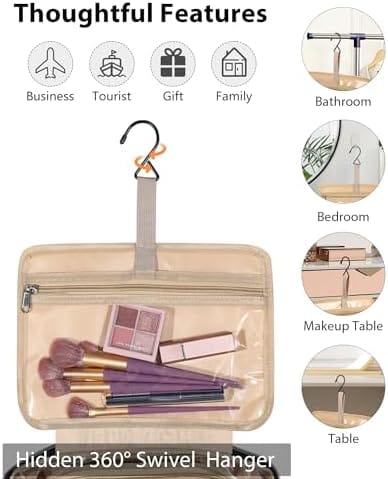 User-friendly Design : Stow-away 360-degree swivel non-slip metal hook for versatile hanging options. Double elastic band feature, Our product ensures secure storage of bottles in its internal pockets, and the adjustable bands can accommodate various widths of stored items. PVC compartment for dry and wet separation, also easily visible. The trolley strap on the back can fix on the trolley case, you also can put it in the suitcase to free your hands.