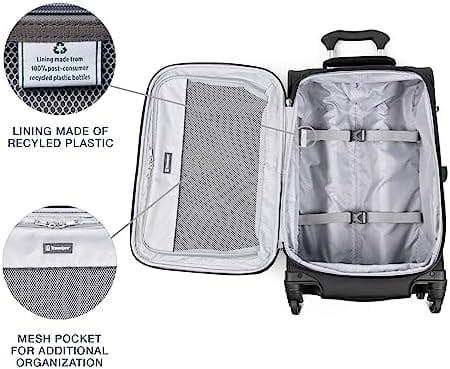 This carry-on soft-sided 21 inch carry on luggage with spinner wheels is so light, it flies; one of our lightest wheeled carry-on suitcases, the Maxlite 5 21″ expandable carryon bag is designed for ultimate comfort and mobility, featuring a 2-position adjustable PowerScope lite handle with patented Contour grip and 4-wheel 360 degree rotating spinners that glide effortlessly. Enjoy packing convenience with two quick-access, exterior front pockets, full-length interior lid pocket, side accessory pocket and adjustable hold-down straps. While the high-tensile-strength expandable zipper on this travel suitcase gives you maximum packing flexibility. This lightweight carry-on luggage has been sizer bin tested to accommodate overhead bin space on most major US airlines. Fully expanded Carry-On may not meet airline restrictions. This carry on bag with wheels is backed by a new and expanded trusted traveler promise-for worry-free warranty coverage from Travelpro. Case Dimensions: 21 inches x 14 inches x 9 inches; Overall Dimensions: 23 inches x 14.5 inches x 9 inches; Weight: 5.4 lbs. Volume : 46 L